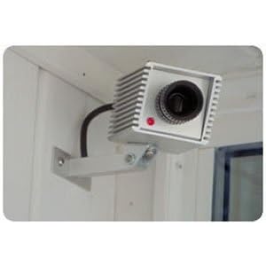 Realistic security camera with blinking LED light helps prevent intruders from even thinking of breaking into your home or business. Adjustable angle, authentic cable and "warning" decals give the fake camera a realistic appearance. It features a weatherproof anodized aluminum housing, mounting bracket with hardware. Flashing LED works for up to two years off of two AA batteries (not included).